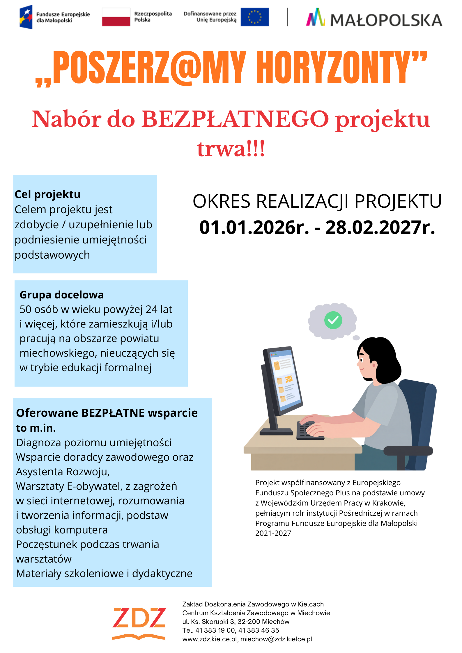 w ramach programu Fundusze Europejskie dla Małopolski 2021-2027, Priorytetu 6. Fundusze europejskie dla rynku pracy, edukacji i włączenia społecznego, Działania 6.15 Kształcenie osób dorosłych poza systemem popytowym, typu projektu: Typ B kształcenie osób dorosłych w zakresie kompetencji podstawowych (wdrażanie Upskilling pathways), z Europejskiego Funduszu Społecznego Plus